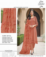 Brighten your winter wardrobe with this stunning 3-Piece Unstitched Suit from the Luxury Embroidered Series. The ensemble features a warm peach/coral Dhanak base, beautifully accentuated with complementary embroidery and intricate printwork.