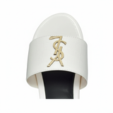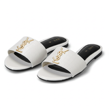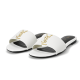 Step into luxury with our Chic White Crocodile-Textured Flat Sandals. These stylish slip-on sandals feature a broad, white strap with a sophisticated crocodile-embossed texture. The upper is highlighted by a prominent, elegant gold-toned logo, adding a touch of high-fashion glamour to the design. The contrasting black and white footbed provides a sleek, modern look, while the flat sole ensures all-day comfort and easy wear. Perfect for elevating your everyday style, these sandals are a must-have for a polished and fashionable summer look.