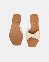 Step into effortless style with these charming and comfortable knot-detail slide sandals. These slides feature a unique, gathered and twisted knot design on the strap, adding a playful yet sophisticated texture to a classic silhouette. The open-toe, square-toe shape provides a modern and stylish look. With a cushioned footbed in a rich tan color and a flat sole, these sandals are designed for all-day comfort. The light-toned upper creates a lovely contrast, making them a versatile choice for any casual summer outfit.