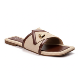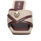 Step into style with our elegant and comfortable sliders, perfect for both casual outings and relaxed gatherings. These sliders are crafted with a chic, textured canvas upper in a neutral beige tone, complemented by stylish criss-cross straps of dark brown faux leather.
