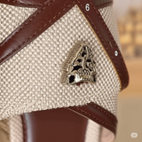 · Design: Criss-cross strap design with a decorative golden emblem.