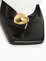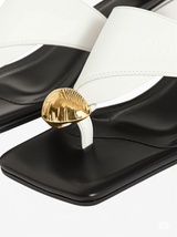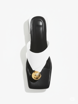 Elevate your style with our stunning Two-Tone Block Heel Slides, designed to add a touch of modern sophistication to any look. These chic sandals feature a striking contrast of crisp white straps and a glossy black footbed, creating a bold and elegant aesthetic. The open-toe, squared-off front adds a contemporary touch, while the unique gold-tone circular embellishment on the thong strap provides a luxurious detail.