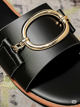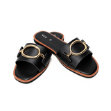 Make a bold statement with our Stylish Black Flat Sandals. These chic sandals feature a sleek, modern design with a broad black strap accented by an elegant gold-toned chain link detail. The sophisticated hardware adds a touch of glamour and edge, making these sandals a standout piece for any occasion. The comfortable flat sole and cushioned footbed ensure all-day comfort, while the timeless black and gold combination makes them incredibly versatile. Perfect for dressing up a casual outfit or complementing a more formal look, these sandals are a must-have addition to your footwear collection.
