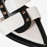 · Intricate Straps: The upper consists of criss-cross straps in black and white, accented with subtle gold studs for a hint of metallic charm.