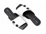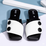 Step out in sophisticated style with these striking two-tone mules. The classic black and white design creates a bold, contrasting look that is both timeless and modern. Featuring a sleek, pointed-toe silhouette, these mules are elevated with a broad, white strap across the vamp, adorned with two prominent black buttons. The closed-toe and closed-side design provides a polished finish, while the low, comfortable heel offers a subtle lift without compromising stability. These mules are the perfect statement piece for office wear, special events, or simply adding a touch of elegance to your everyday ensemble.